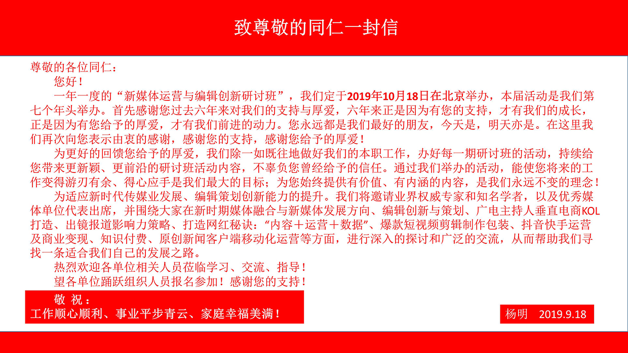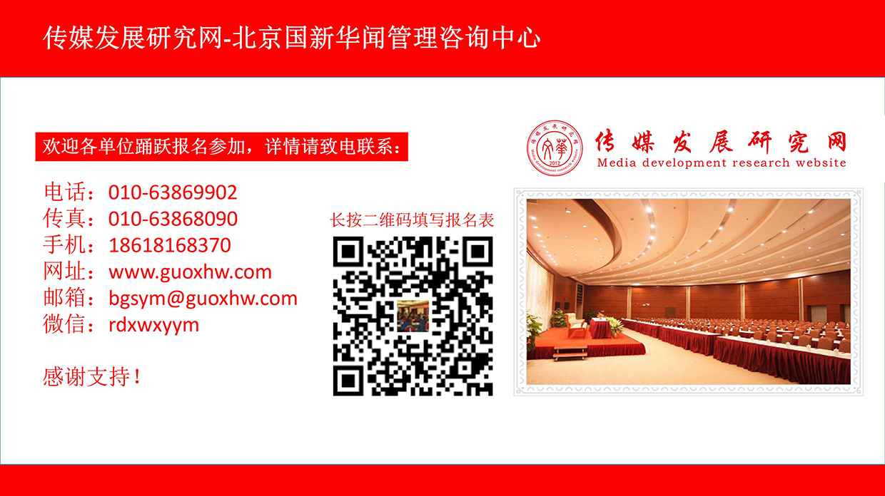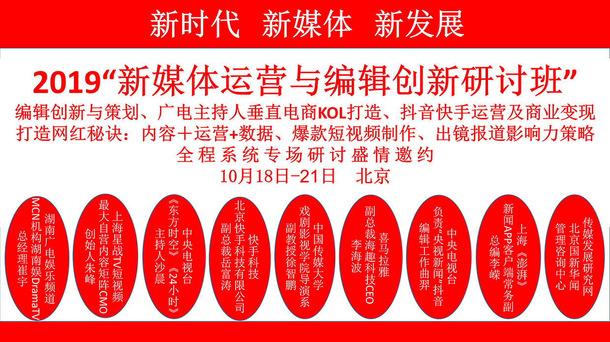 我們定于2019.10.18—21日在北京舉辦一期:“新媒體運營(yíng)與編輯創(chuàng )新研討班”的活動(dòng),誠邀您的光臨!對您的支持與厚愛(ài)我們表示由衷的感謝!對您的支持我們無(wú)以回報,只有以匠心精神,勤勤懇懇、認認真真做好我們的每一項工作來(lái)報答您給予的厚愛(ài),只有這樣才能對得起您曾經(jīng)對我們的信任和一路同舟!