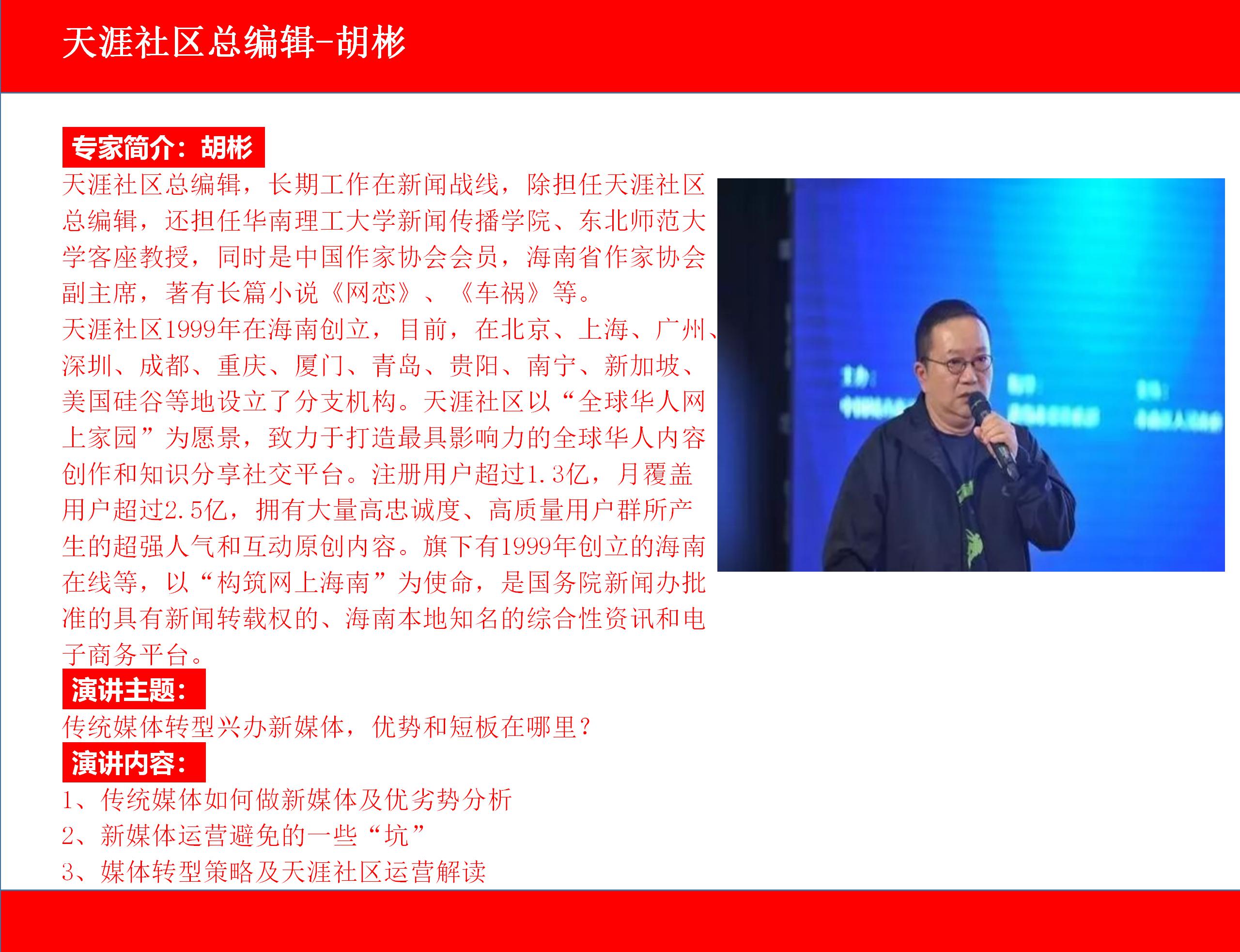 澎湃新聞常務(wù)副總編輯李嶸、廣電第一MCN機構湖南娛樂(lè )Drama TV總經(jīng)理崔宇、新媒體運營(yíng)與策劃大咖趣片場(chǎng)創(chuàng )始人李振杰、天涯論壇總編輯胡彬,全是大咖,與您相約在最佳季節、最美海南共商新媒體運營(yíng)之道。