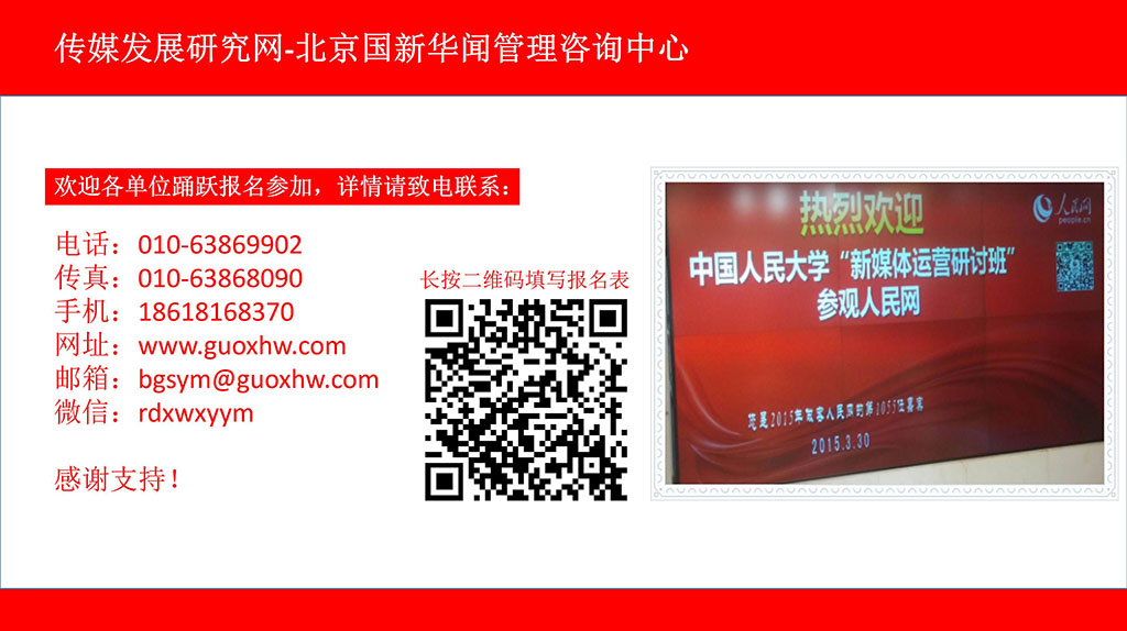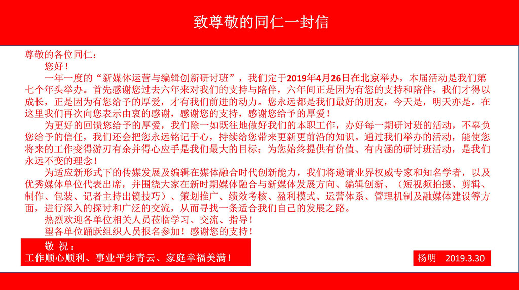 我們定于2019.4.26日—29日在北京舉辦一期:“新媒體運營(yíng)與編輯創(chuàng )新研討班——短視頻拍攝、剪輯、包裝、制作、記者主持出鏡報道研討班”的活動(dòng),誠邀您的光臨!現活動(dòng)正火爆進(jìn)行報名中,再次對您的支持與厚愛(ài)我們表示由衷的感謝!對您的支持我們無(wú)以回報,只有以匠心精神,竭盡全力,再接再厲,認認真真做好我們的每一項工作來(lái)回饋給您,只有這樣才能對得起您曾經(jīng)對我們的信任和一路同舟!